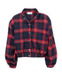Oversized bomber jacket with shoulder pads, made from plaid wool-blend cotton fabric.