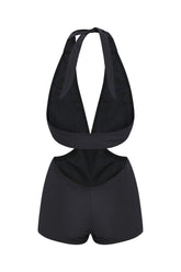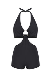 One-piece swimsuit featuring a sporty short-style bottom and a halter bikini top with neck tie and a central chest clasp.