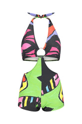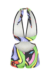 One-piece swimsuit featuring a sporty short-style bottom and a halter bikini top with neck tie and a central chest clasp.