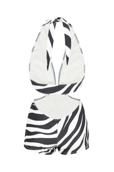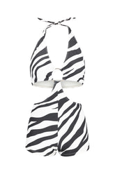 One-piece swimsuit featuring a sporty short-style bottom and a halter bikini top with neck tie and a central chest clasp.