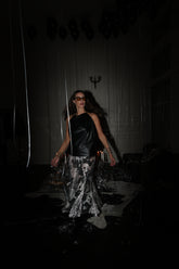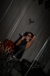 A full-length top made from soft vegan leather with a draped turtleneck design and back tie closure. The bottom wraps around the body with adjustable strings for a perfect fit.