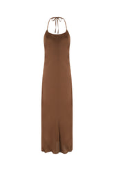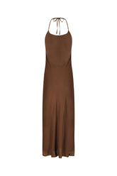 Midi-length satin halter dress with an elegant, fluid silhouette.