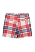 Thick plaid shorts with a slightly longer back hem. Featuring welt pockets and a hidden back zipper closure.