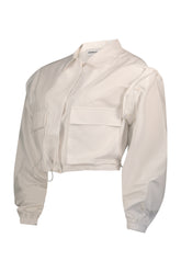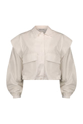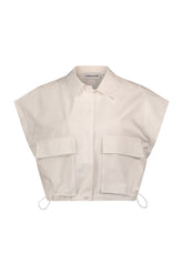 Elegant oversized vest made of poplin fabric with wide shoulders. Side stoppers create a balloon-style silhouette. Long sleeves attached with buttons, can be worn with or without.