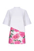 A unique dress combining an oversized tricot top with a floral-printed lycra skirt. The twisted design creates the effect of a shirt over a skirt with an asymmetric finish.