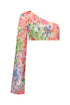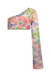 One-sleeve chiffon top with a side zipper and double-layered fabric on the body. The sleeve is long and flared.