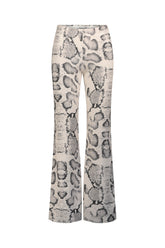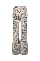Fitted pants made from lycra terry fabric, flared hem, and snake print