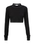 crop top made from lightweight, semi-sheer jersey fabric with a small boat neck design. One-size fits sizes 34-40.