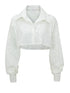 A button-down shirt made of embroidered Swiss lace fabric, featuring elongated sleeves.