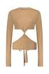 A long-sleeve shirt with a twisted cutout at the waist and a partially open back And closure with a tie.