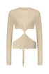 A long-sleeve shirt with a twisted cutout at the waist and a partially open back And closure with a tie.