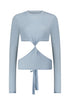 A long-sleeve shirt with a twisted cutout at the waist and a partially open back And closure with a tie.