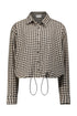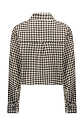 A button-up shirt made of plaid fleece fabric. Stoppers at the bottom for a ballooned and gathered look.