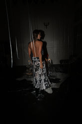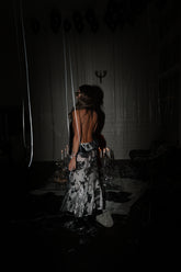 A midi skirt crafted from voile fabric with a thin elastic waistband, designed with a soft flow along the sides of the body and finished with sequin detailing at the hem.